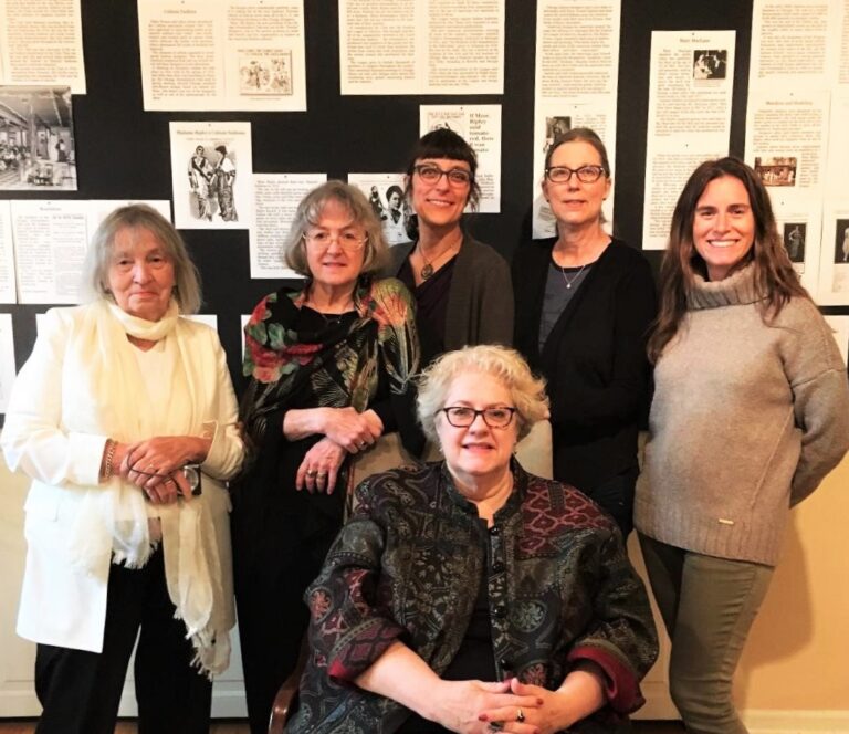 The "Threads of Imagination" exhibit team. Standing from left to right: Artist Judie Anderson, RHS Historian and exhibit designer Linda Lamberty, Artist Nicole Burns, Artist…