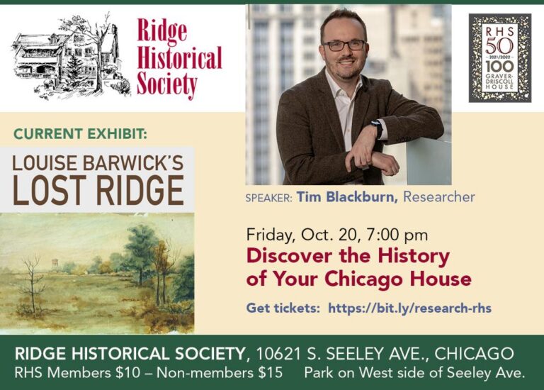 Friday, Oct. 20, 7:00 pm “Discover the History of Your Chicago House” – Tim Blackburn, Researcher You will learn how to research the history of…