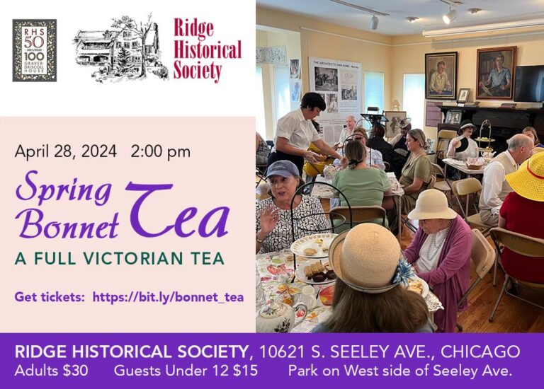 An invitation to the Ridge Historical Society’s annual Spring Bonnet Tea fundraiser at the historic Graver-Driscoll House