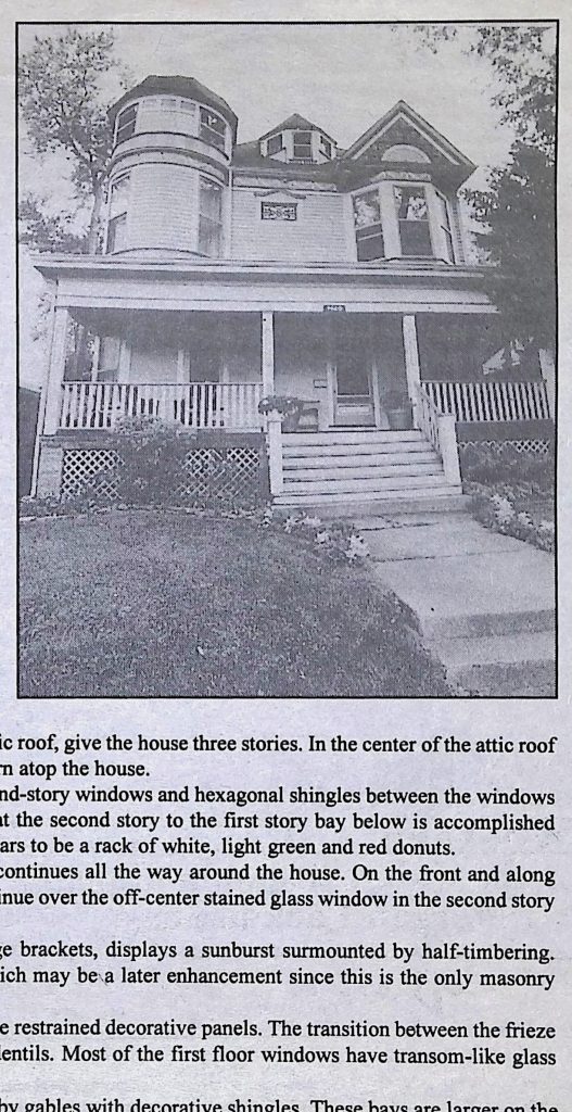 In Queen Ann style, exterior wall surfaces were primary decorative elements. Flat walls were avoided both by the use of structural features, such as towers, bays and overhangs, and by using wall materials of different textures. In the house at 9620 Hoyne Ave., the roofline is dominated by a round tower capped by an octagonal roof on the south side of the front, and by a high gable atop the north front bay on the second floor. These, combined with a steep attic roof, give the house three stories. In the center of the attic roof a polygonal dormer apes the tower to its south and is almost a lantern atop the house.