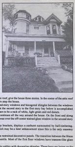 As it stands now, the house is domi-nated by its gables, whose prominence is especially emphasized by the current paint scheme. Each of the gables consists of a heavily-framed triangle, and each rests upon a low triangle formed by denticulated boards. The roof gables and the matching gable over the main entrance all contain half-timbering, consisting of a crosswork of timbers with spaces filled either with plaster or windows. The roof gables rest on large brackets, below which the walls of horizontal boards are interrupted only by windows. The long porch extends across the entire front of the house, its roof resting on brackets that sit on col-umns. The massive front door is on the north end of the porch, and is adjoined by a small high bay of windows. At the south end of the house is the porte-cochere, sup-ported on stone columns with exposed rafters carrying its roof. The new matching garage was completed in 2003.