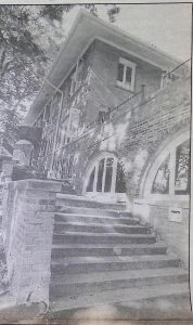 With the advent of the car, the only convenient approach to the property was a driveway on the gentler slope west of the house. But in the original configuration this presented a comparatively bland facade to visitors. So a second tower was erected and the massive main entrance door was set in a stone-faced wall alongside it. This alteration was probably designed by Waterman, most likely before the annexation of Morgan Park to Chicago in 1914, since city records hold no permit for it. There is a permit for general repairs in 1927, and this was perhaps when the windows were altered to the present small rectangular panes.