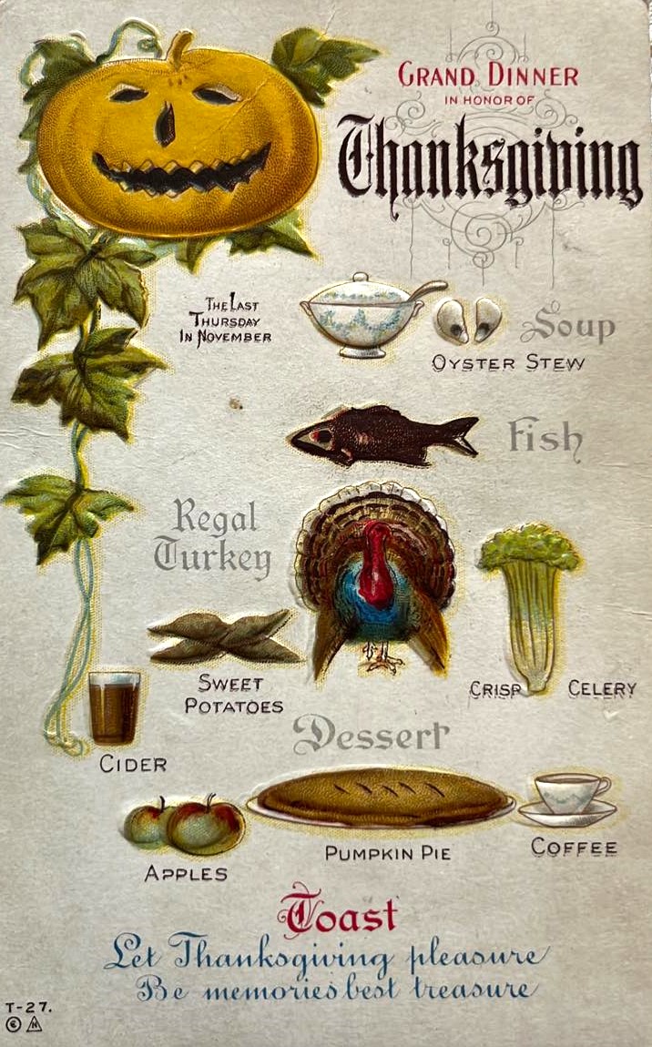 This vintage postcard shares a typical dinner from 100+ years ago.