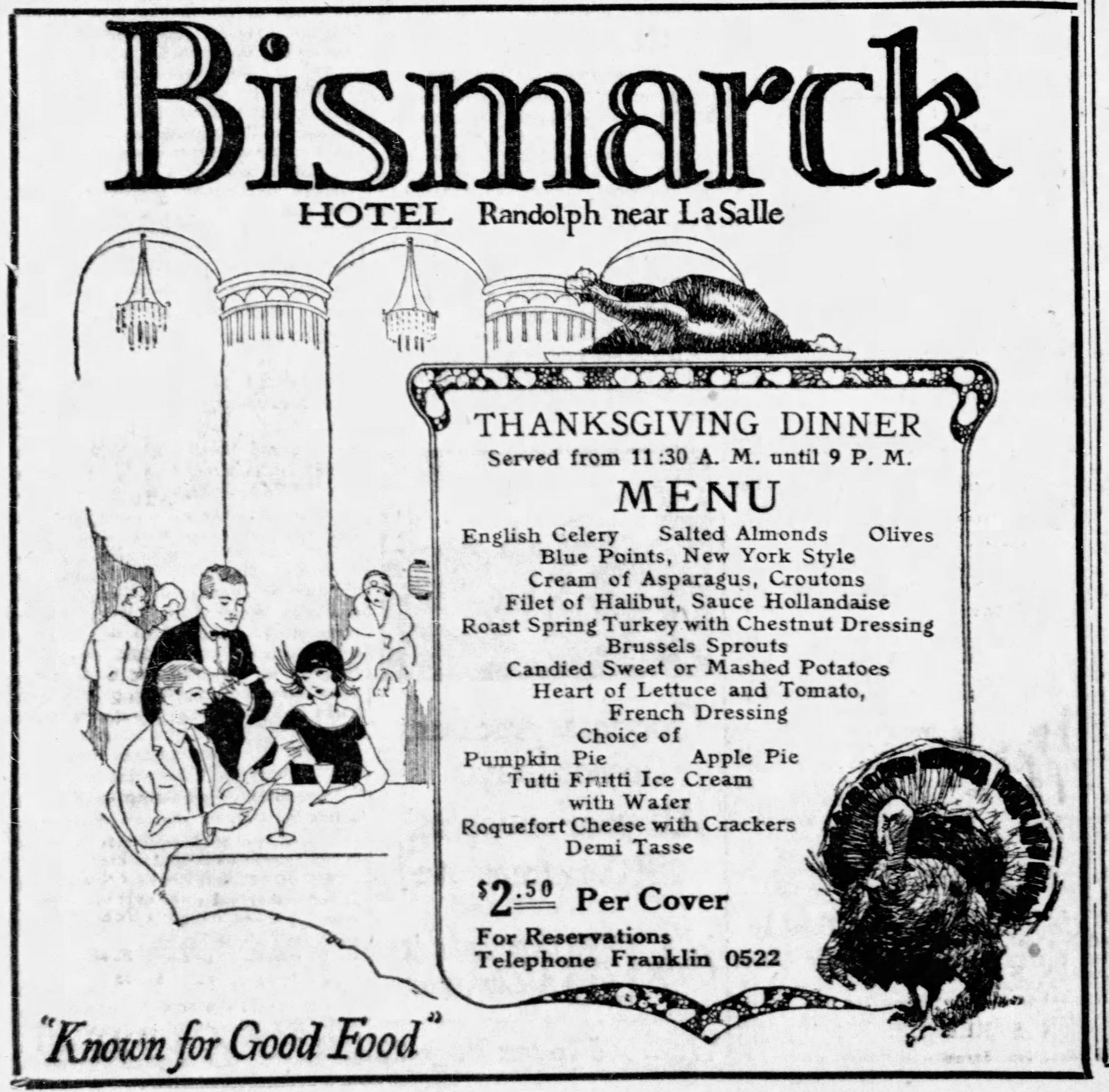 Diners could enjoy a multi-course meal at the downtown hotels. Here is an ad for Thanksgiving dinner at the Bismark Hotel that appeared in the Chicago Tribune in November 1923.