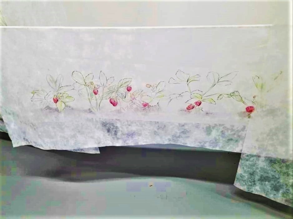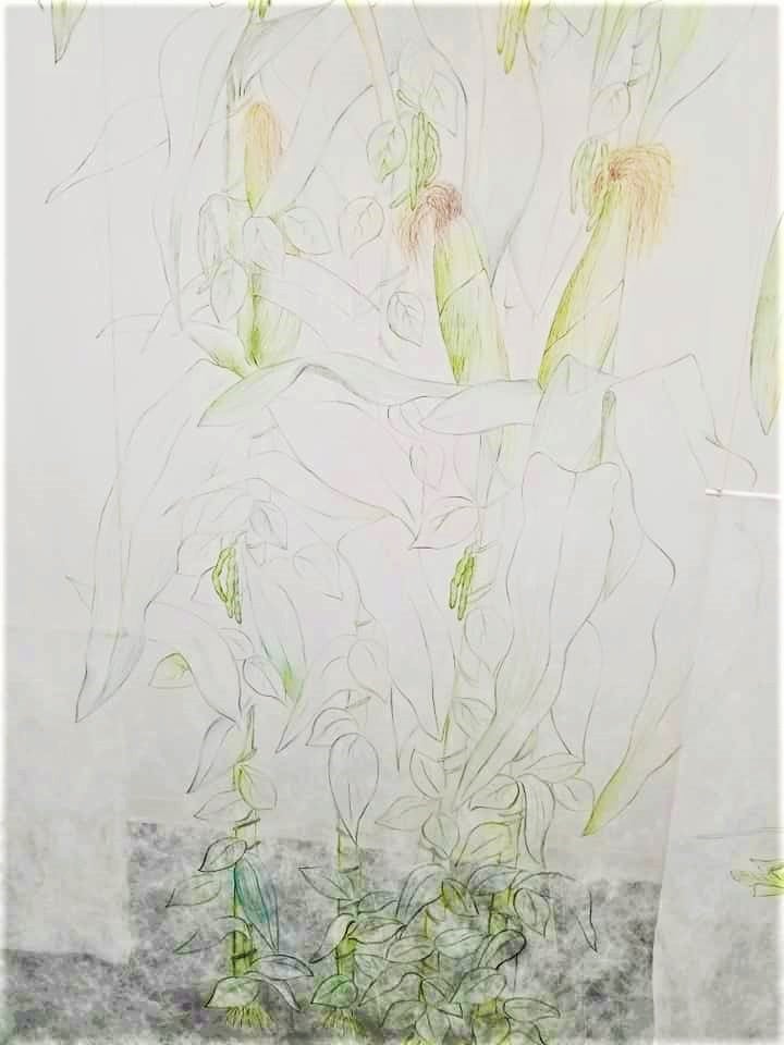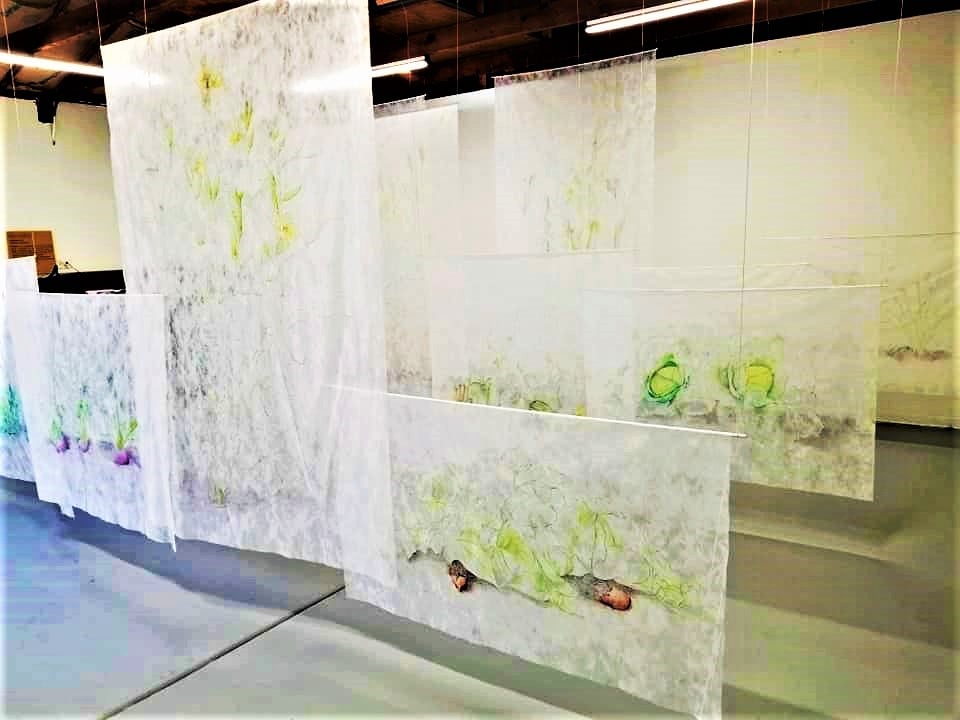 The images are created in pencil, colored pencil, and marker, on sheer material that is used to cover crops. The panels are hung to overlap and sway in the breeze as the viewer walks through them. The delicate drawings and white sheer material create a ghostly, dreamlike experience of days past when the Ridge was natural and rural and some of the land was used for raising and gathering food.