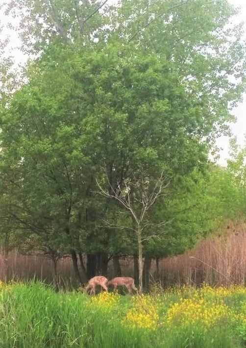 The Oak Savannah remnant at Hurley Park. The drier areas had numerous groves of timber, predominated by oak. Also included were fruit trees like apples and plums, nut trees like walnuts and hickories, and birch trees good for making canoes. Numerous species of birds and small mammals made their homes in the trees. Deer and bears and lynx found refuge there.