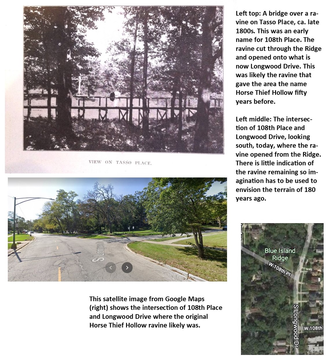 First, William Barnard, one of the earliest settlers on the Ridge, wrote there was a ravine just south of what is now 107th Street that was called Horse Thief Hollow. An early newspaper included a photograph of a bridge over a deep ravine on Tasso Place, an early name for 108th Place. Government Geological Survey maps do show a ravine was there although there is little sign of it today. David Herriott, the postmaster of Morgan Park and publisher/editor of the Morgan Park Post newspaper, who knew local history well, identified 108th Place at Longwood Drive as the site of Horse Thief Hollow. This ravine is likely the spot mentioned by Andreas.