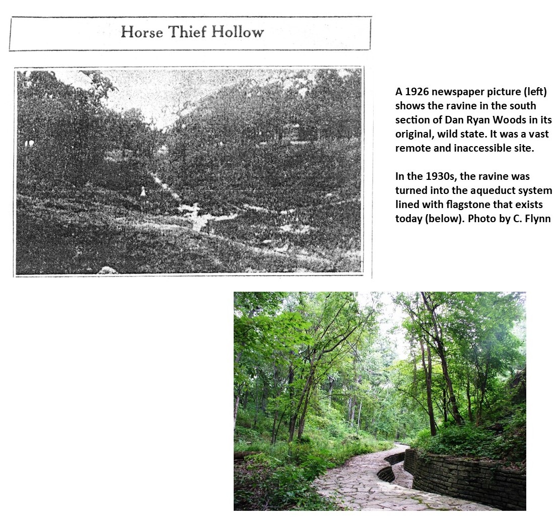 In 1926, another newspaper wrote that the ravine in the south section of Dan Ryan Woods, which became the aqueduct system known today, was a “rendezvous of the biggest gang of horse thieves operating in Illinois.” This was too far north to be considered Morgan Park, and even that article admitted the section was the most “inaccessible portion of the whole tract.” Andreas states the thieves used a buggy to move their equipment and supplies and it is difficult to envision driving a buggy into that location, but horses could have been kept in there.