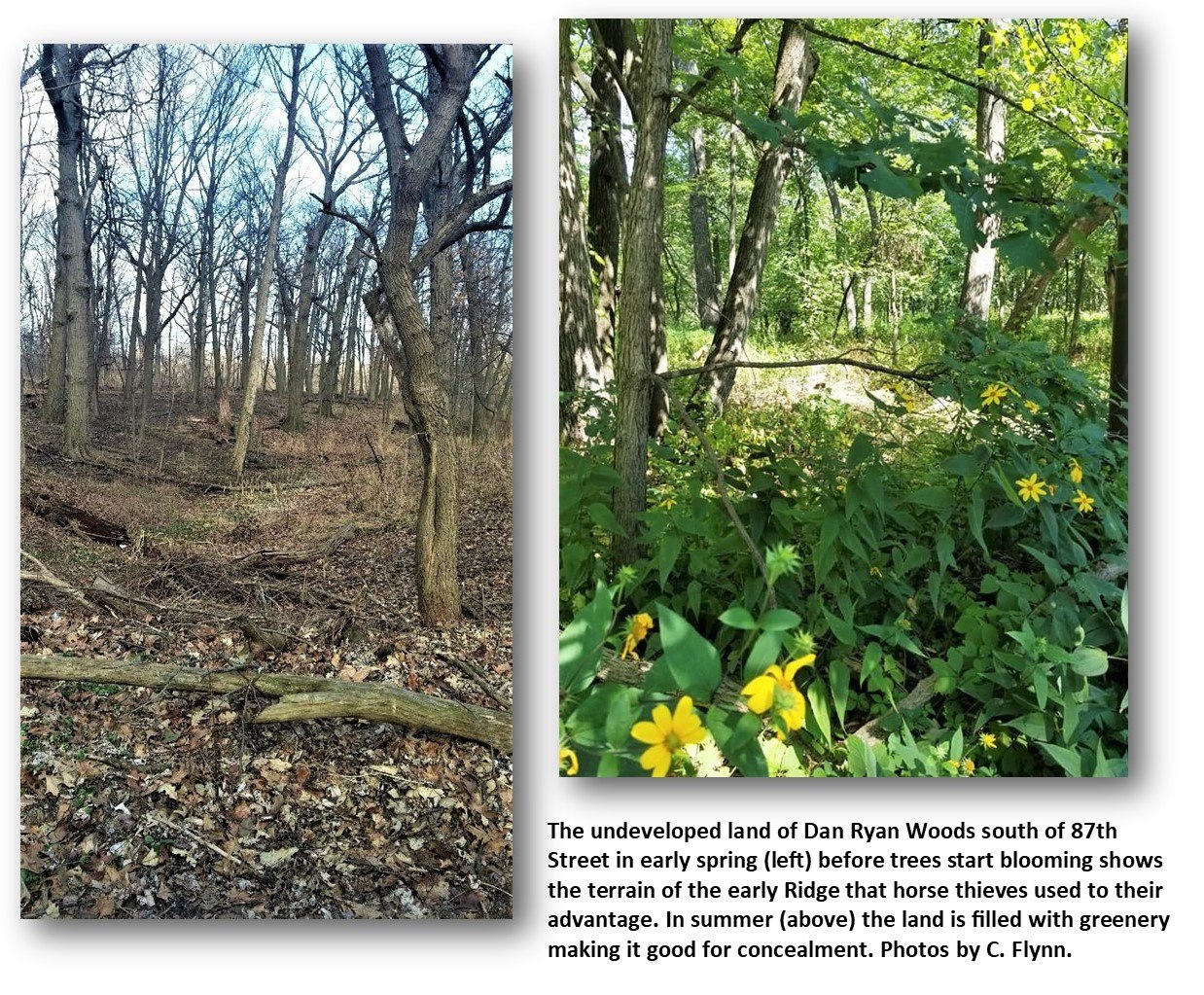 Because so much development has gone on, and the original topography of the land has been altered substantially, today imagination has to be used to picture what the area looked like 180 years ago. The undeveloped land in the south section of Dan Ryan Woods, the last remnant of the “wild Ridge,” does give a good idea of the natural terrain that horse thieves would have found advantageous to their endeavors.