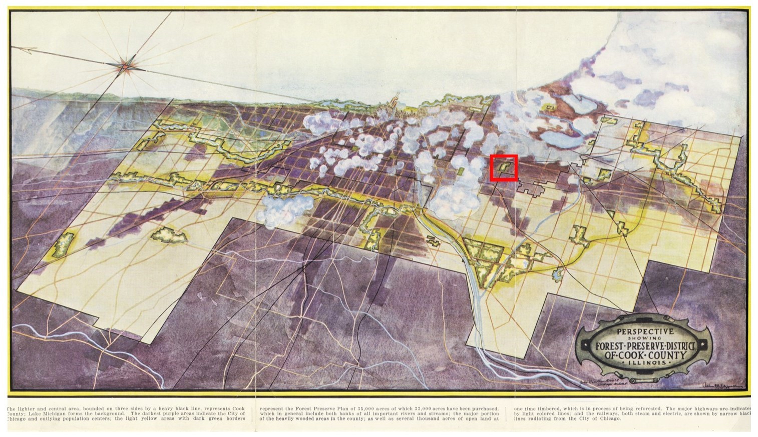 The Plans went on to report: “It is recommended that these three tracts be acquired by the [Chicago park] districts, as soon as possible, by friendly condemnation suits. These tracts are better suited for city park use than for forest preserves, and the resulting acres to be gained for forested lands, may be used to acquire other forested areas which form connections with the present preserves.”