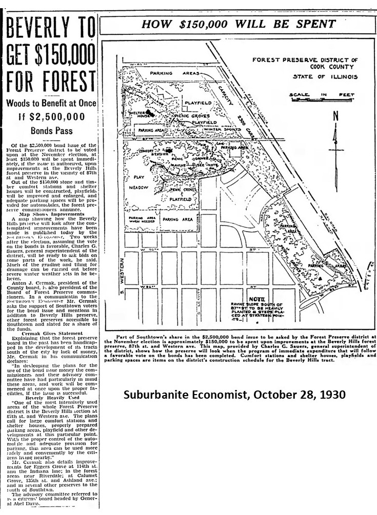 In 1929, a Forest Preserve Advisory Committee developed a document, “Recommended Plans for Forest Preserves of Cook County, Illinois.” The Plans recommended that the Beverly Hills Preserve [by then its proper name was the Dan Ryan Woods] and two other preserves within city limits “be planted with care with forest stock, and used for the present as picnic groves for small and large groups.” The report stated that much planting was needed on these tracts.