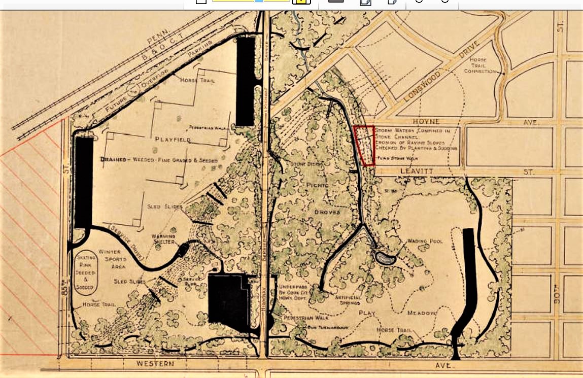 A few years later, the federal agencies got involved, and more formal plans were developed and projects completed. The detail of 1937 plans shows the features added in the 1930s, including the flagstone pedestrian underpass on 87th Street.