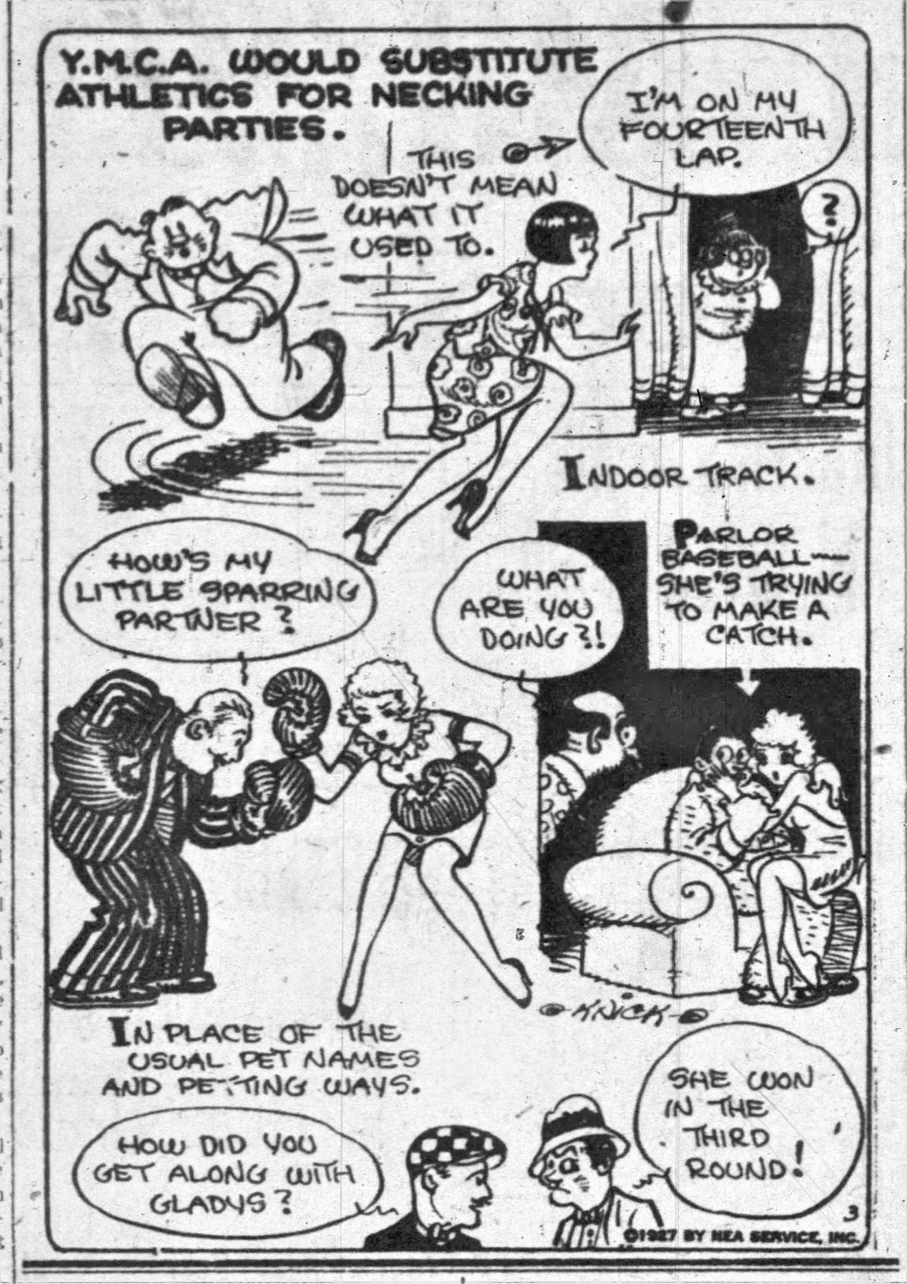 Automobiles offered new opportunities for necking, providing more privacy than, say, a movie theater or the front porch swing. But there were drawbacks here, also. In one case, a 16-year old boy “borrowed” his neighbor’s auto to take his 15-year old girlfriend for a ride. Becoming distracted by each other, they drove into a tree. Undaunted and apparently unharmed, they abandoned the auto and moved to a nearby bench, where the police found them. The boy wound at up at the juvenile detention center and the girl was taken home to her parents. One of several morals to this story was to not neck while driving.