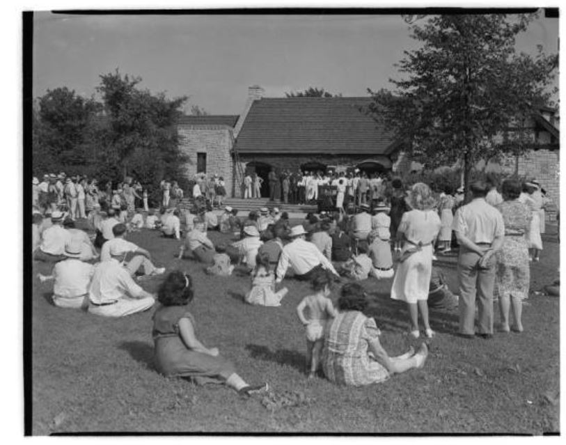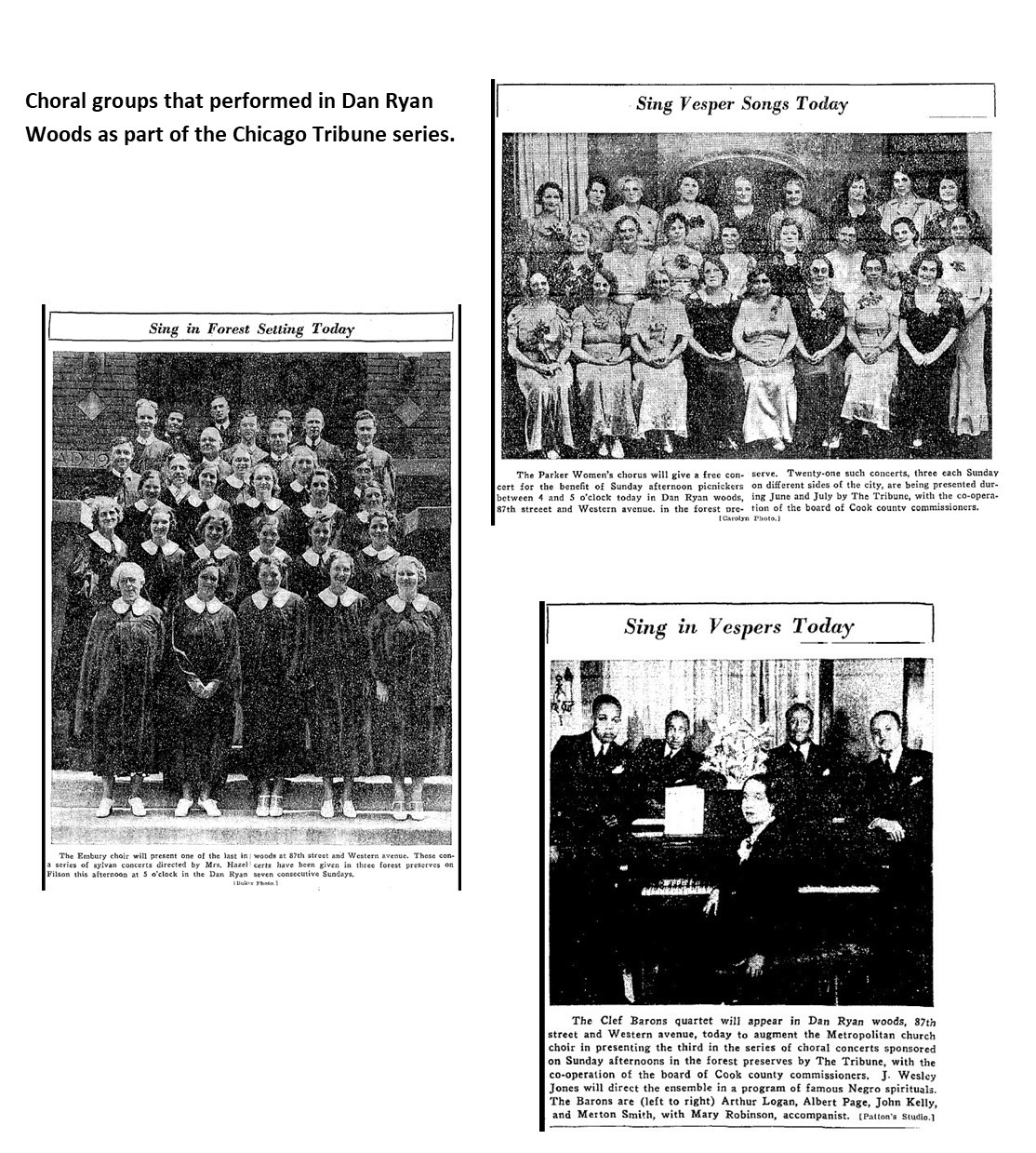 Starting in the summer of 1938, for several years the Chicago Tribune sponsored a “twilight music series” featuring choral concerts in several preserves, including Dan Ryan Woods (DRW). On Sunday evenings, choirs from around the city and suburbs, ranging from church groups to opera companies to children’s choirs, performed in the woods. Everything from spirituals to romantic light opera to popular Irving Berlin songs – “God Bless America” premiered in 1938 – was featured.