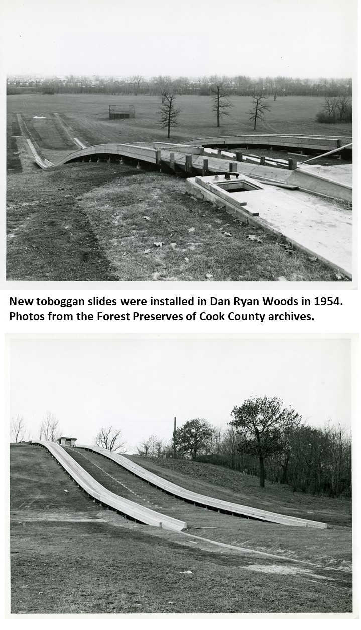 The Forest Preserve Ski Club started in 1925 under the auspices of the Cook County Board of Commissioners. The Club conducted professional and amateur ski jump competitions in several of the preserves, and the Ridge in DRW was one of the sites where a ski slide was built. It was to the north of the warming shelter.