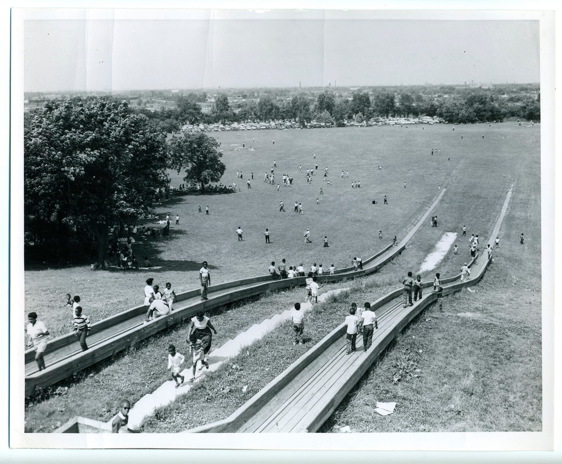 DRW had toboggan slides from its earliest days. They were routinely updated and/or replaced. In 1937, it was reported that six toboggan slides and a small ski slide were newly constructed at DRW, likely by one of the New Deal government agencies. These toboggan slides were “banked, ‘S’ curve runs.”