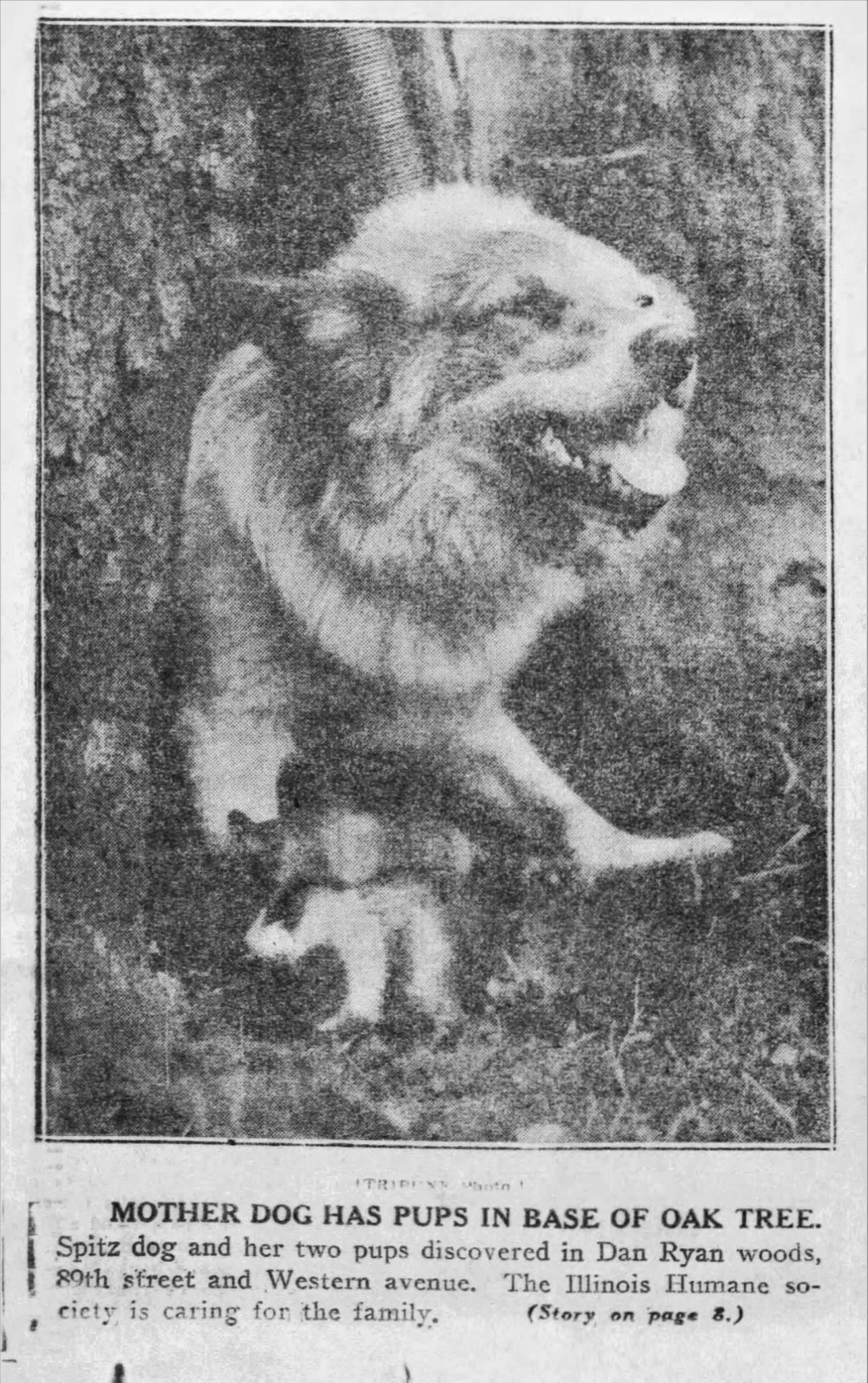 There were several early stories about stray dogs in DRW. In 1934, a mother spitz and two newborn puppies were found living in the hollow base of a tree around 89th Street near Western Avenue. She was deemed “vicious” by DRW workmen, a natural reaction for a mother dog protecting puppies, but the concern was that children might approach her and be bitten. The Illinois Humane Society captured the dog and puppies.