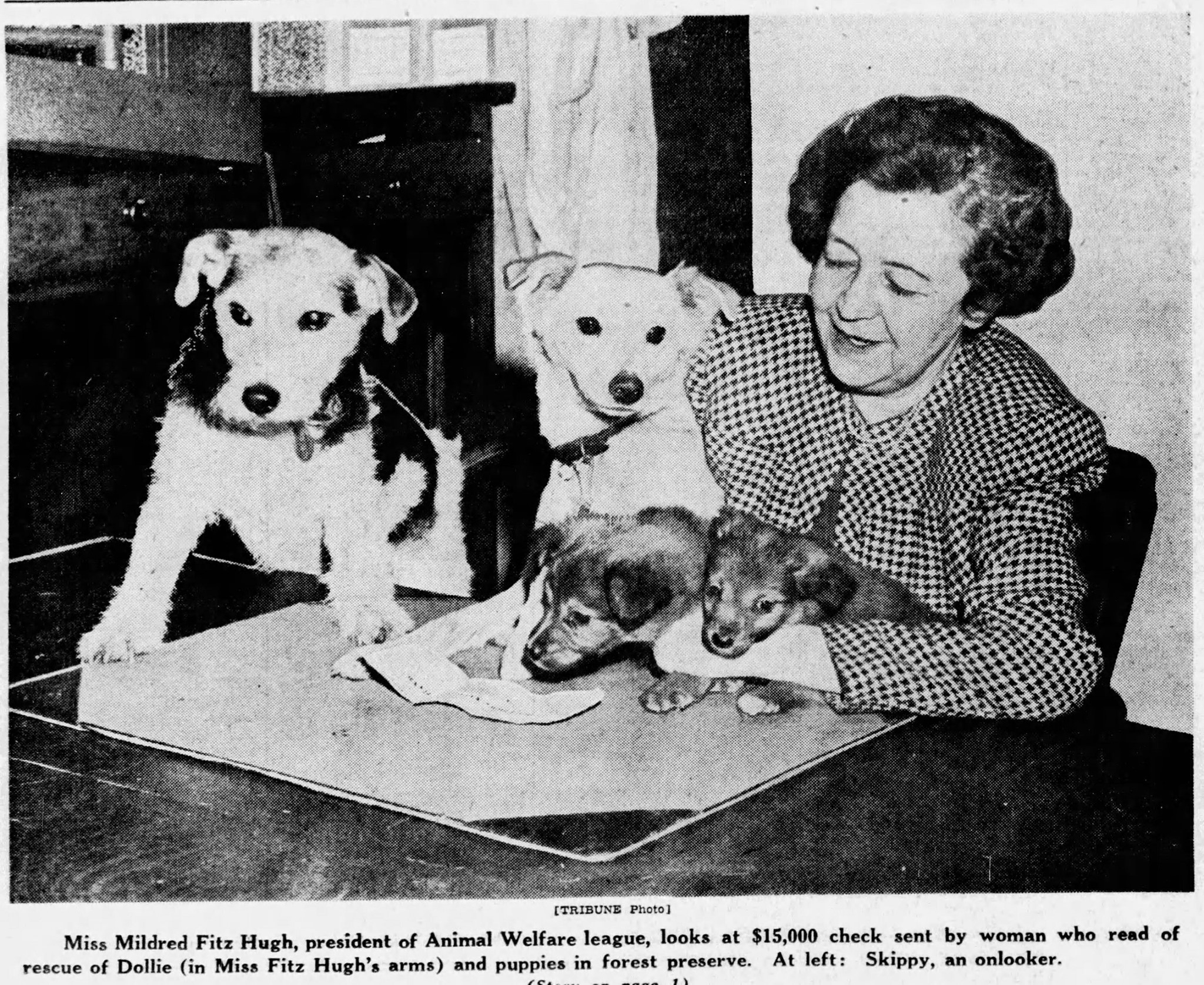In 1945, a “brown toy shepherd” dubbed “Dollie” by the press became a media darling when she “haunted Ryan woods” for several months but was finally captured by the Animal Welfare League. Dollie led the League agent to a den she had dug under bushes where they found her newborn puppies, their eyes still unopened. The Chicago Tribune’s coverage of the rescue of Dollie and her pups led a woman from California, the honorary president of the league, to donate $15,000 for an animal shelter in Chicago.