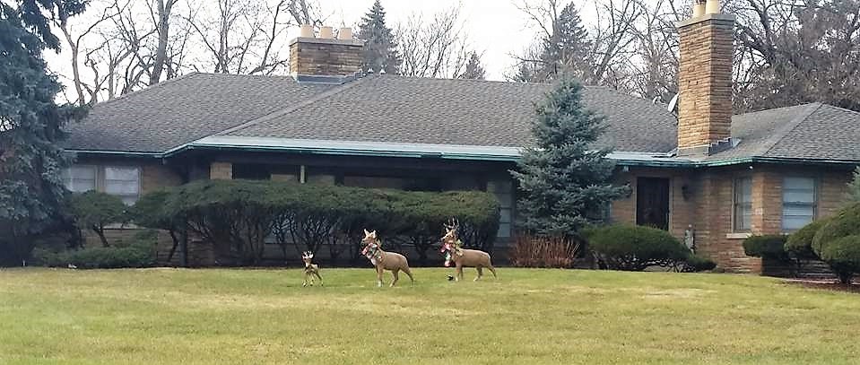 The cast iron deer family outside the home at 119th Street and Bell Avenue is a familiar sight. In 1968, the doe disappeared for several weeks after Halloween. Police on foot patrol found it in the middle of a sidewalk in a residential area blocks away but could not move it because it weighed 450 pounds. Returning with more help, the doe was gone. It turned up in DRW. How the lawn ornament was removed unnoticed in the first place was a matter of conjecture because it was so heavy, and there were no marks on the lawn that it had been dragged; in fact, there was no trace of the theft at all, not even a footprint. The police returned the doe via a police van, and because of this prank, the owners cemented the deer into the ground, where they remained for fifty years. However, it was recently noticed that the fawn is now gone.