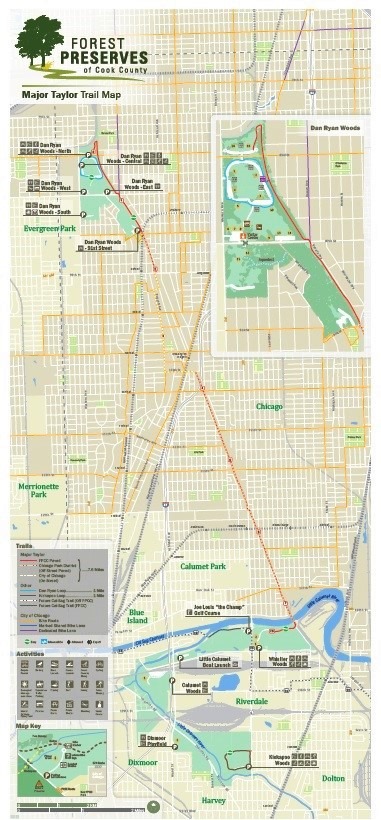 The path was named the Major Taylor Trail in honor of Marshall Walter “Major” Taylor (1878-1932), an African American professional cyclist. He received the nickname “Major” early in his career when he performed as a trick rider wearing a military uniform.