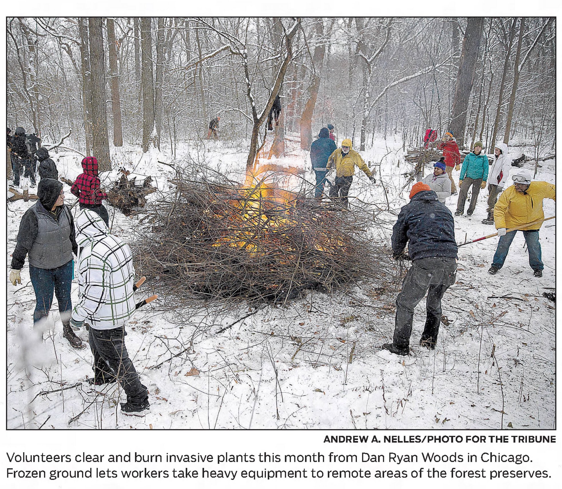 Gone from DRW are the elm trees that once were plentiful around Chicago. The FPCC lost over 100,000 trees due to Dutch Elm Disease, the fungal infection spread by elm bark beetles, after the disease entered the U.S. in the 1950s. In more recent years, DRW has lost hundreds of trees to the emerald ash borer. Dozens of invasive plant species such as buckthorn are also enemies of native ecosystems. Removing invasive plants from DRW and the other preserves is an on-going challenge.