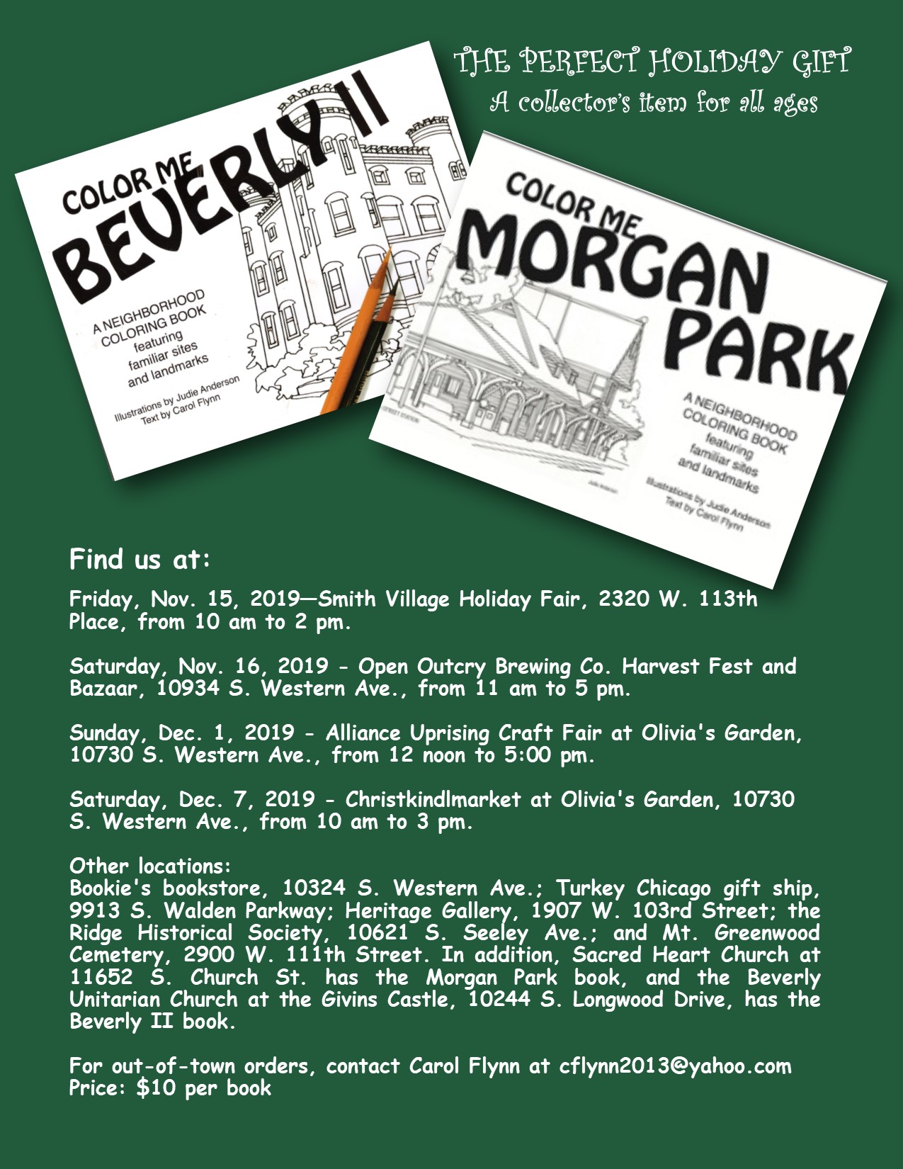 Christmas will be here in 2 1/2 weeks – not much time left to buy and ship presents. Still wondering what to get for that friend or relative who moved away from Beverly/Morgan Park? That's easy – Color Me Beverly II and Color Me Morgan Park. These limited edition collectors' item coloring books for all ages have proven to be very special and easy-to-mail nostalgia gifts for former Ridge residents who like to reminisce about the "good old days" – a cone from Rainbow Cone, a bike ride by the Castle, a train trip downtown from 111th Street, watching the St. Patrick's Day Parade on Western Ave. Each illustration includes s brief page of history on the site.