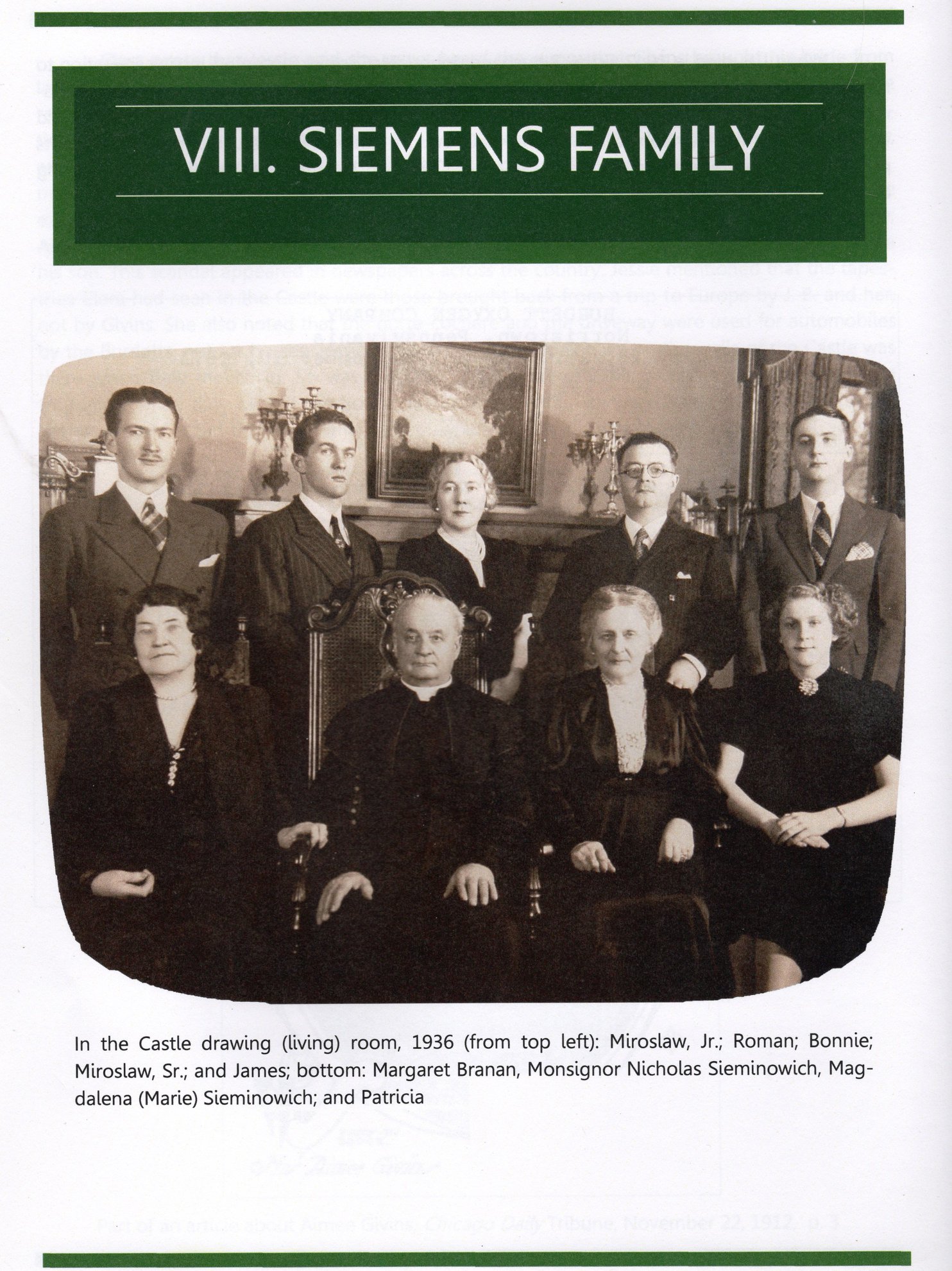 Dr. Miroslaw and Bonnie Siemens (Sieminowycz, Sieminowich) owned and lived in the Givins Beverly Castle at 103rd St. and Longwood Drive from 1921 until the Beverly Unitarian Church bought the building in 1942. Dr. Siemens was born in 1885 in Ukraine and came to the USA in 1906. He graduated in 1913 from Bennett Medical College, affiliated with Loyola University. He practiced at Roseland Community Hospital and kept an office in the Castle.
