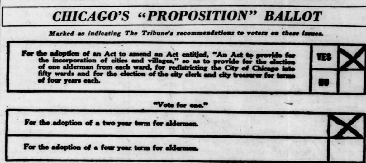 In November of 1920, the voters of Chicago approved a proposition to divide the city into 50 wards, each with about the same population based on the 1910 U.S. Census. Each ward would have one alderman, elected every two years. This replaced the old system of 35 wards of widely varying populations, each with two aldermen serving staggered two-year terms. There was an annual election in which half the aldermen were elected.