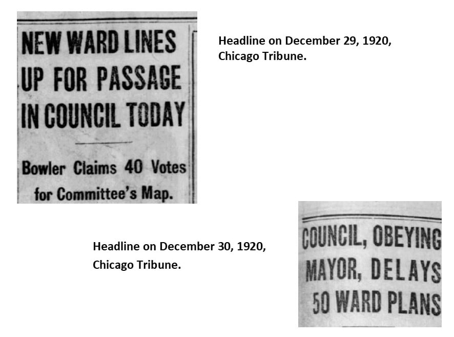 The city council committee delayed its vote on a plan for weeks, trying to reach a compromise with the mayor’s committee. Many aldermen withdrew their support of the city council plan so as not to antagonize the mayor. Both sides accused the other of gerrymandering and favoritism.