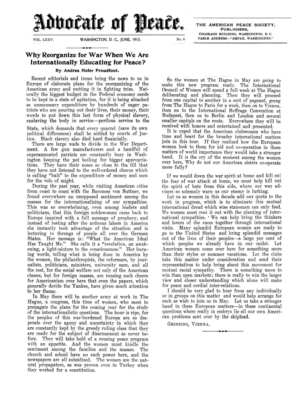 The Hofer sisters were also accomplished writers and speakers. Using Andrea as our continuing example, one of her calls for action in the peace movement is attached to this post. She became a sought-after speaker at international meetings of women. She was prominently featured at the International Council of Women meeting at the Hague in the Netherlands in 1913. The theme adopted by women’s groups throughout this time was: “In time of war prepare for peace; in time of peace prepare for its continuance.”