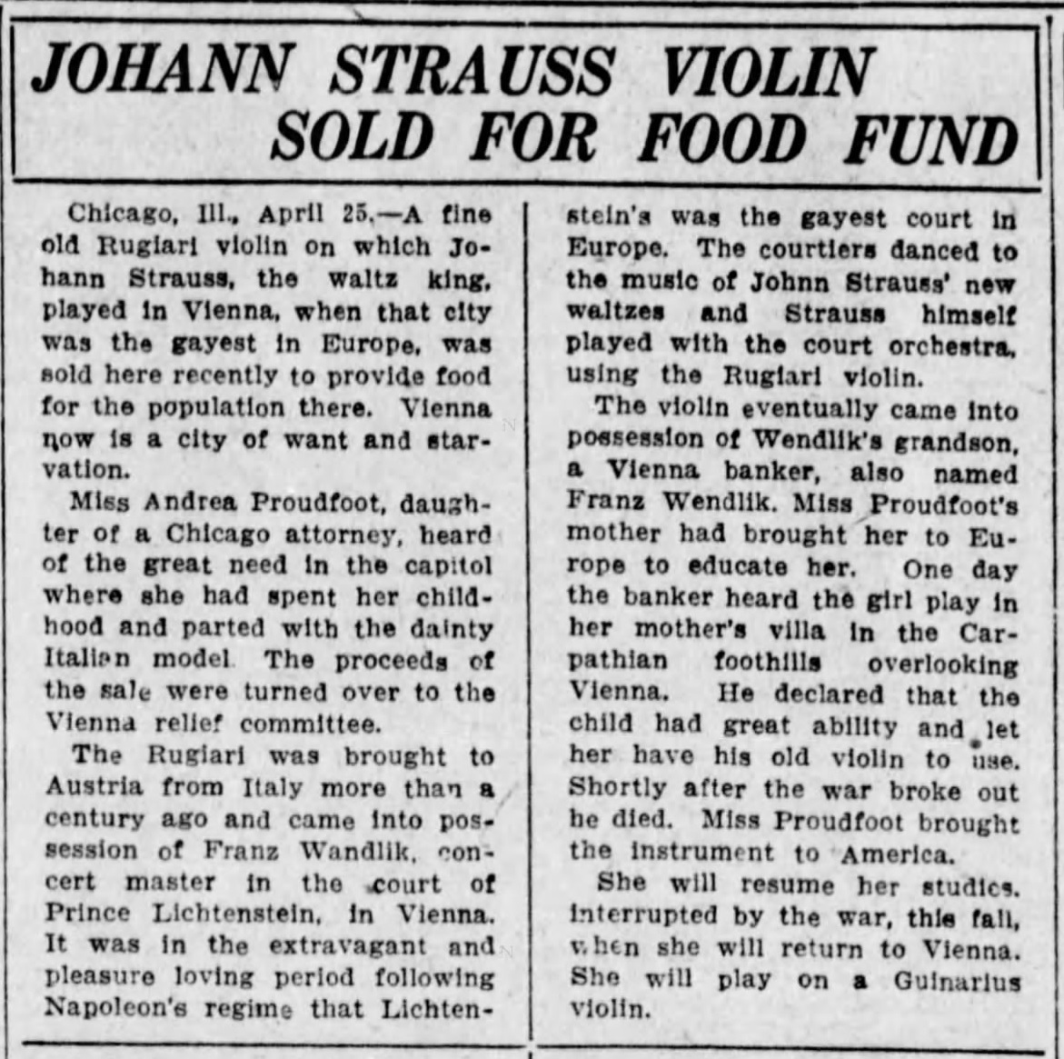 Altruism was passed down to the next generation of Hofer descendants, as evidenced by a 1920 newspaper article about one of Andrea’s daughters donating a valuable violin that she acquired in Vienna for the Vienna relief effort.