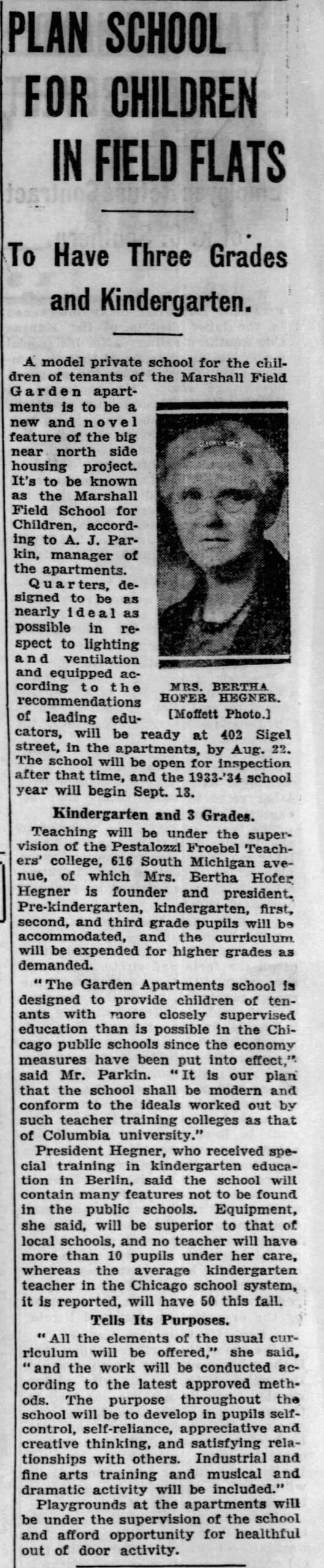 Bertha developed new education programs throughout her career. One of her later accomplishments was detailed in a 1933 Chicago Tribune article which is attached to this post. She developed and administered a kindergarten, grade school, and playground in the Marshall Field Garden Apartments, a housing development directed by Marshall Field III of the department store family to provide affordable housing and to spur development in the surrounding areas. The apartments, located at 1400 North Sedgewick Street in Old Town, are still in use today as subsidized housing.
