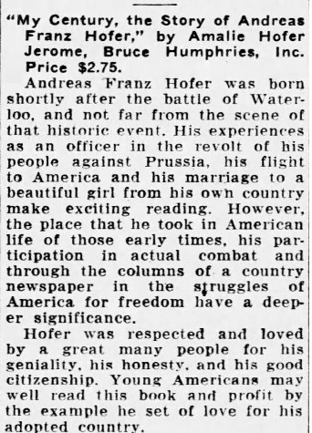 Amalie adapted her father’s diary into a biography, and in 1939 published “My Century – The Story of Andreas Franz Hofer.” The book was reviewed by newspapers around the country. The Shreveport Journal in Louisiana gave a poignant review of the book that is attached to the post.