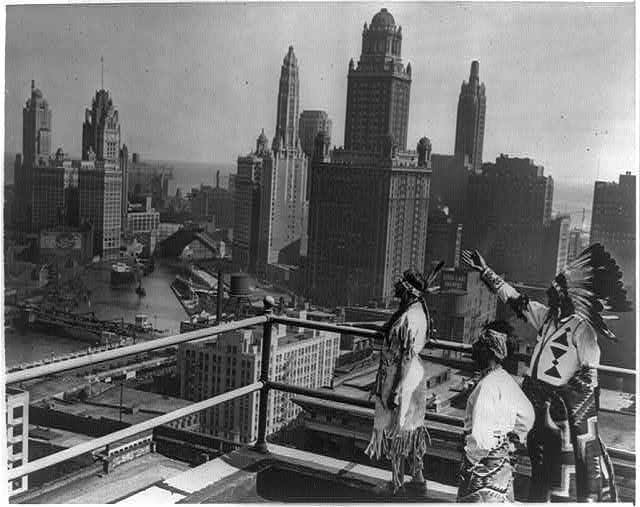 Photo: “Princess O-Me-Me, a Chippewa; Sun Road, A Pueblo; and Chief Whirling Thunder, a Winnebago, looking over Chicago's skyline from the roof of the Hotel Sherman.” October 3, 1929. From the Library of Congress.