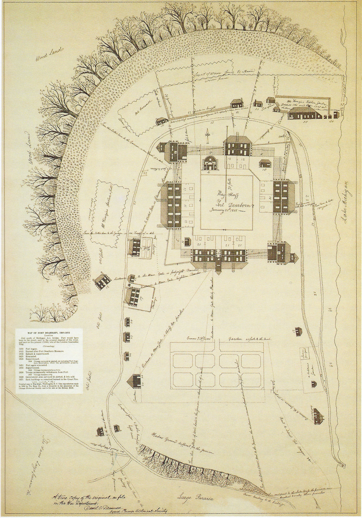 Fort Dearborn was constructed by U.S. troops under the command of Captain John Whistler in 1803. The fort was named for Henry Dearborn, the Secretary of War. It was located where the Chicago River joins Lake Michigan at what today is Wacker and Michigan Avenues.