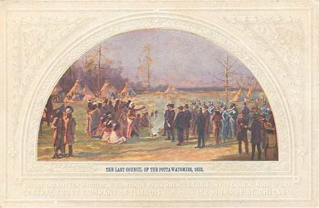 The greater Chicago area includes ancestral lands of 25 to 30 distinct Native American groups. By the time the Native Americans gave up the land via treaty with the U.S. Government and left the area in 1833-35, the predominant group living here were the Potawatomi people.