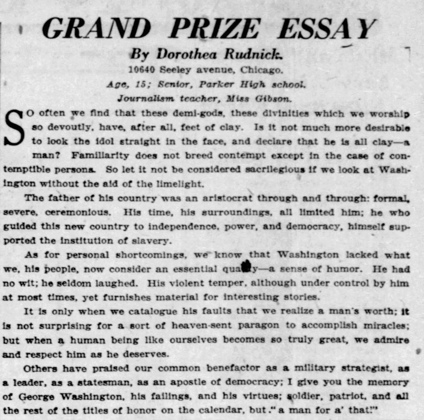 As a high school student at the age of 15, she won a Chicago Tribune essay contest on George Washington. Her essay is attached. It was a different take on George Washington: he was a flawed man, like all of us, making it that more notable that he rose to greatness.