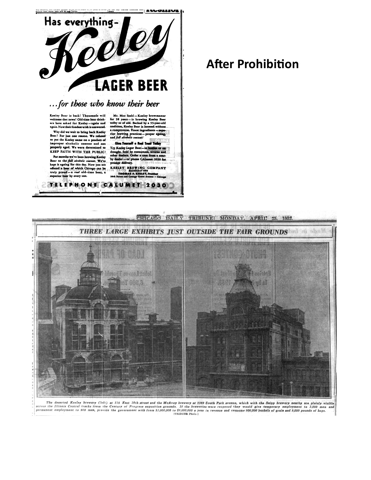 As no surprise, Keeley was anti-Prohibition and worked against that movement. With Prohibition, the brewery closed and sat vacant and decaying for over a decade while Keeley advocated for ending Prohibition and creating legitimate jobs and taxes. He died shortly after Prohibition ended, while in the process of reopening the brewery.