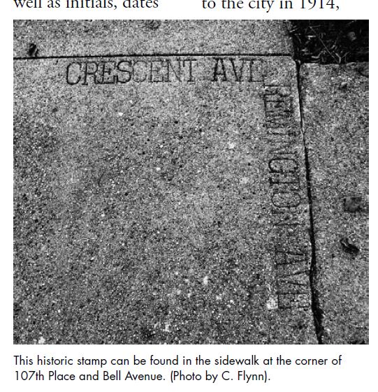 If you look closely, you can still find the old street names stamped into some of the sidewalks. These pictures from past RHS newsletters show two examples. The corner of 107th Place and Bell Avenue has a stamp for Crescent Ave. (Bell) and Remington Ave. (the previous name for 107th Place).