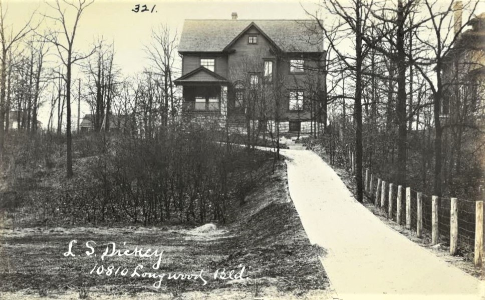 Dickey, Jr., had the house at 10900 S. Prospect designed by Chatten and Hammond in 1912. The picturesque Arts and Crafts-styled house is set on a lot of several acres of beautiful old oak trees. Design elements include a half-timbered double gable, sloping brick buttresses, and a flanged segmental entry arch. Dickey, his wife Bessie Adele (Robinson) Dickey, and their daughter and two sons made their home there.