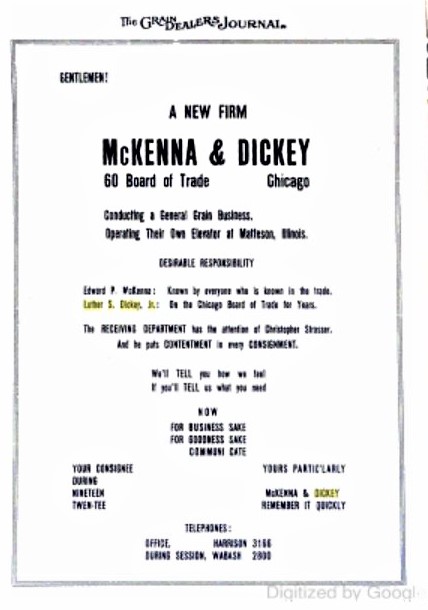 Luther Samuel Dickey, Jr., was a well-known stock broker and grain trader. He was a member of the Chicago Board of Trade and the New York Stock Exchange. He had his own company for years, McKenna and Dickey.