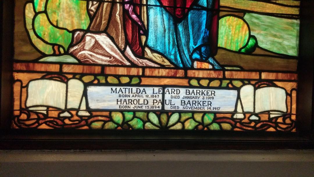 England J. Barker was a prominent businessman who settled in Morgan Park with his family. His company, UARCO, manufactured business machines. This window was installed when the church was built in 1925. It is in remembrance of Barker's wife Matilda and son Harold. Photos by C. Flynn.