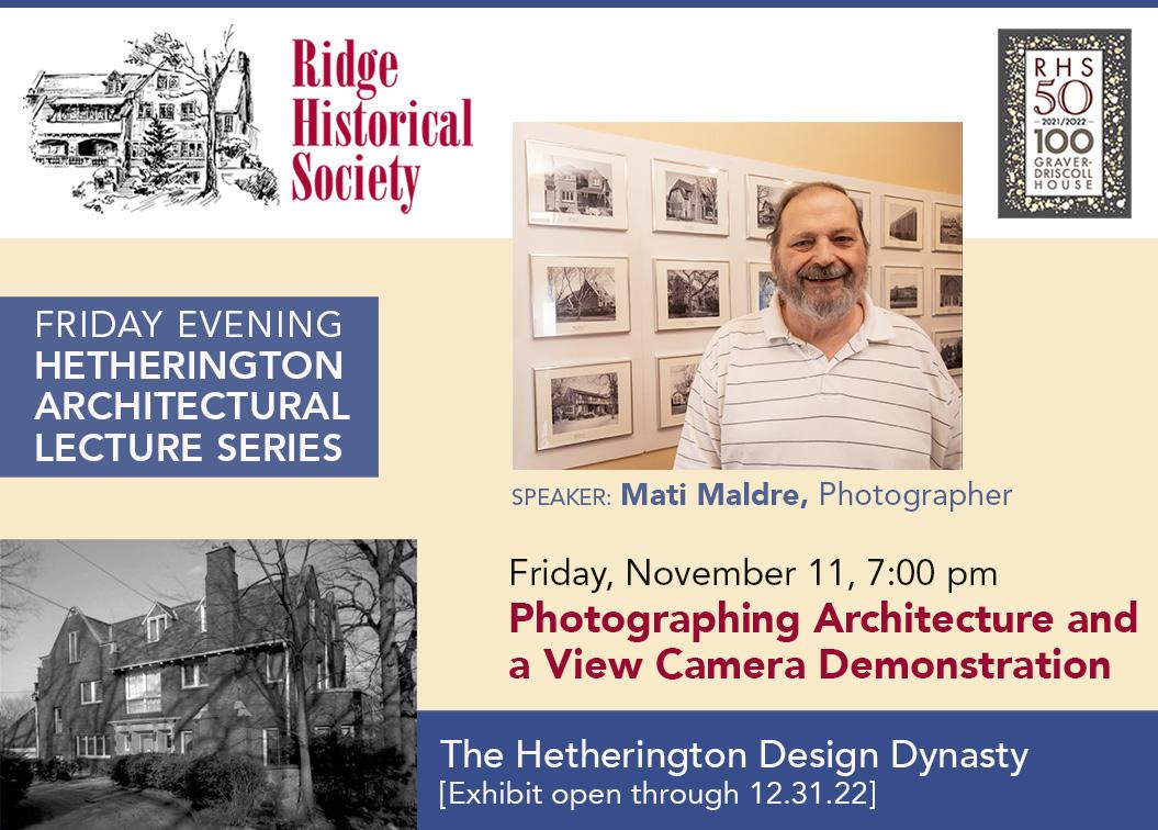 The third program in the Hetherington Architectural Lecture Series will be held this Friday, November 18, at the Ridge Historical Society, 10621 S. Seeley Avenue, beginning at 7:00 p.m.