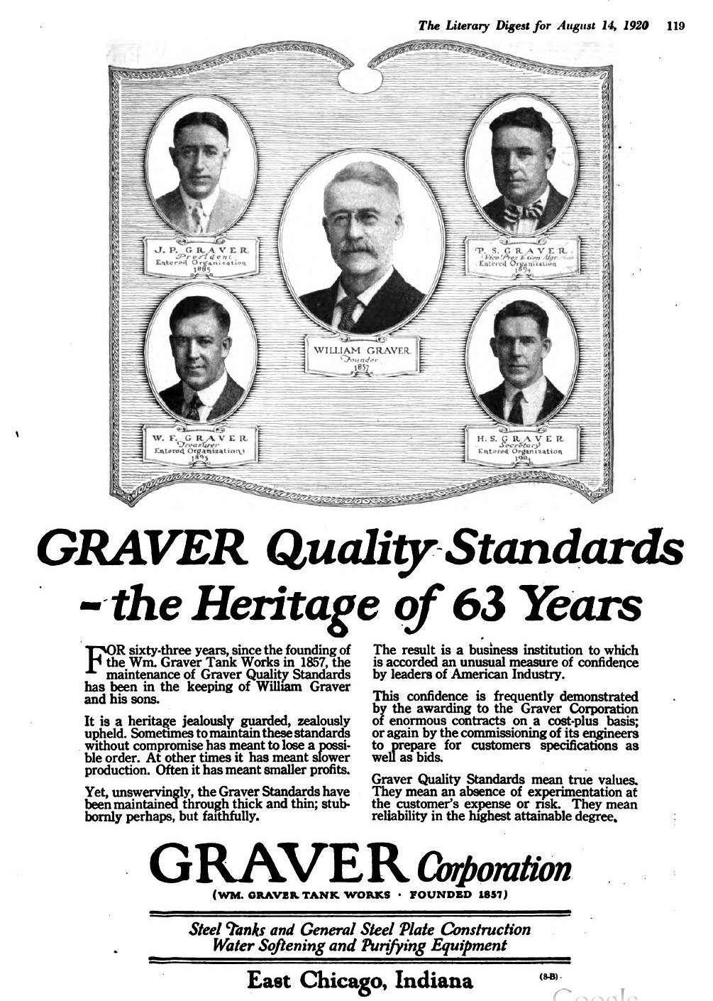 The name was changed to the Graver Corporation in 1919, and an advertising department was added to the business. At the end of 1920, according to Moody’s Analysis of Investments, the business had assets close to $3 million, and the stock of the company was all held by the Graver brothers.