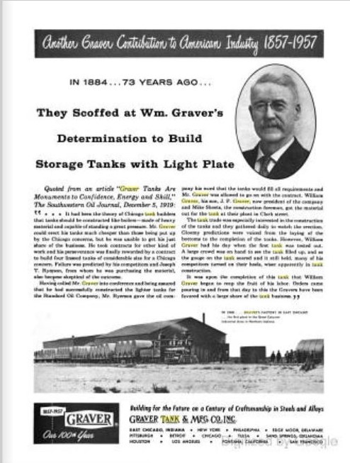William worked for a few years for the Standard Oil Company as an appraiser of oil storage tanks. The tank business grew due to the boom in oil wells and refineries. The Gravers decided to relocate the tank-making business to the growing Midwest, arriving in Chicago in 1884. There William proved his lighter weight tanks were reliable and cost-efficient, and his reputation and business grew.