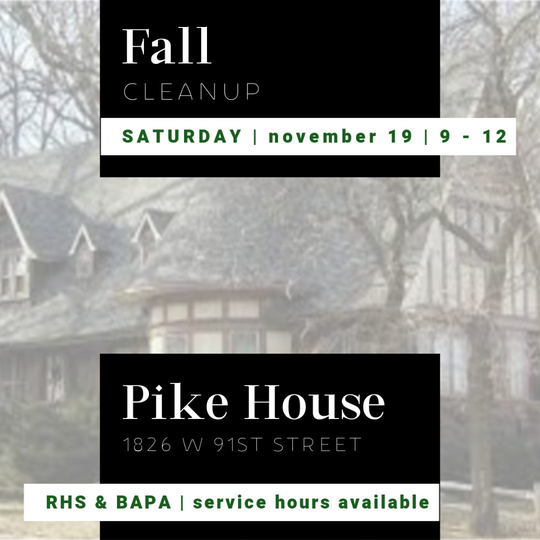 The Ridge Historical Society/Beverly Area Planning Association Historic Buildings Committee invites area residents to help with a fall yard clean up at the historic Eugene S. Pike House, 1826 W. 91st St., on the southern edge of the Dan Ryan Woods, on Saturday, Nov. 19, from 9 a.m. to noon. Students can earn community service hours. All volunteers are welcome. For additional information, contact RHS at 773-881-1675 or ridgehistory@hotmail.com.
