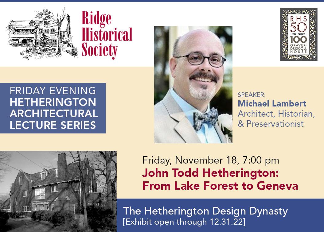 RHS is pleased to welcome Michael Lambert, architect, historian, and preservationist, who will speak on “John Todd Hetherington: From Lake Forest to Geneva.”