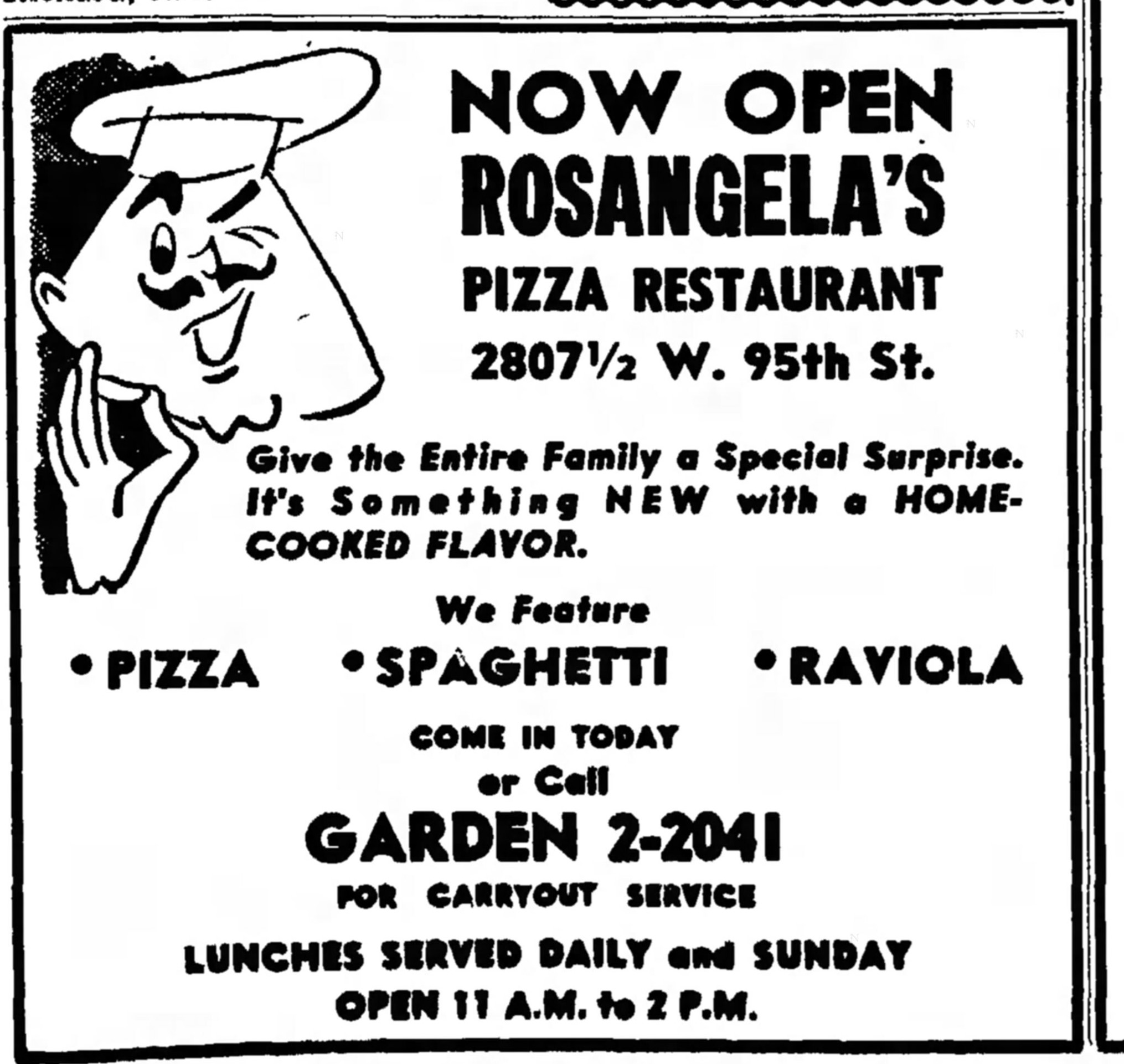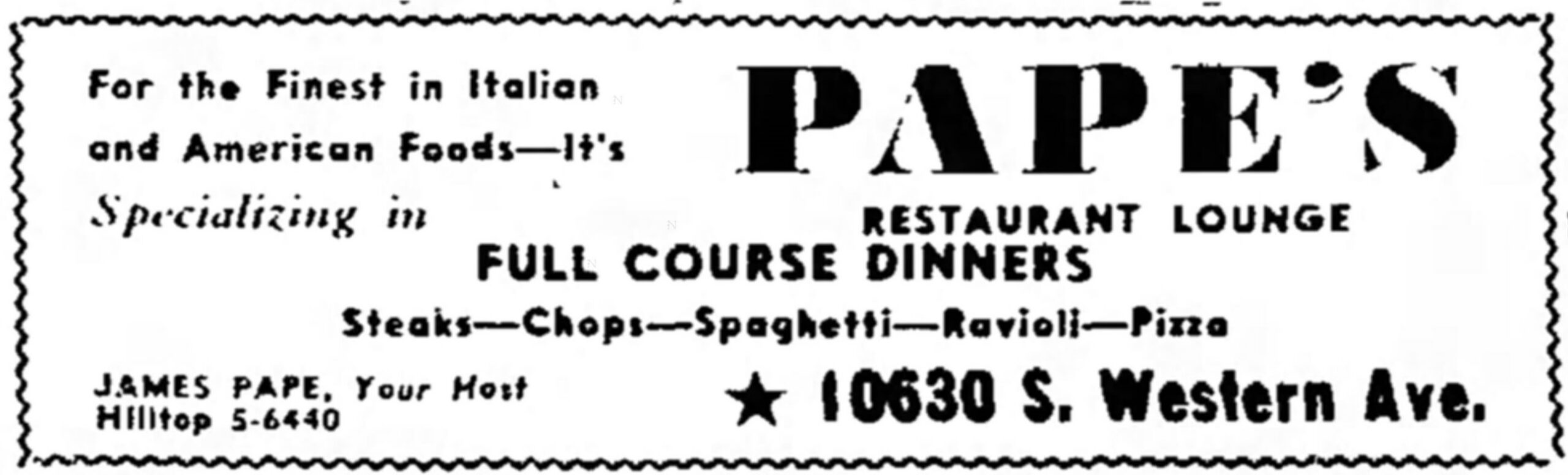 The first advertisement found for a restaurant serving pizza in Beverly was for Pape’s Restaurant and Lounge at 10630 S. Western Avenue in 1950. In a review, Pape’s was described as “a handsome restaurant and lounge where every attention goes into making your dining and wining visit a most enjoyable one.”