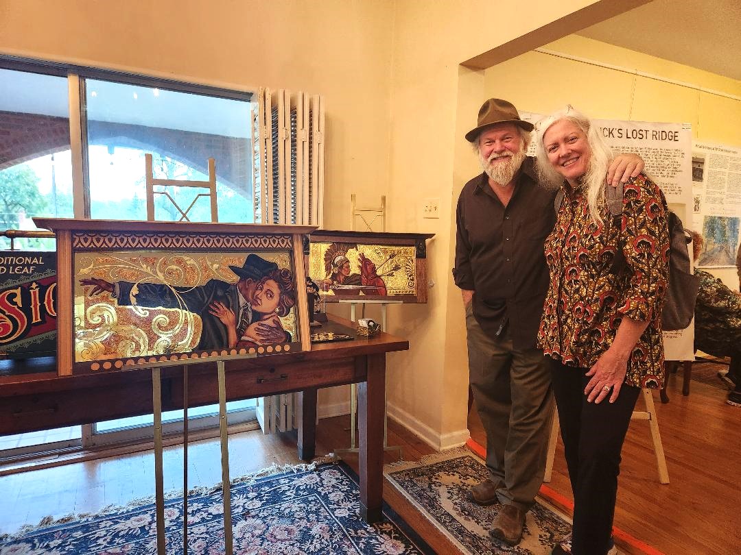 Sal always does a great job of matching artists with venues, and this is a perfect example – an artist who uses old-world processes to create beautiful images on glass, using etching, paints, gold leaf and other techniques, matched up with the one place in the community you are able, even encouraged, to be "old school" and think about the past!
