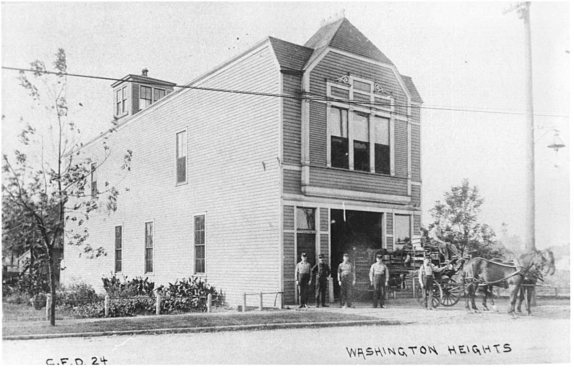 Beverly Hills, as this section of the community eventually became known, annexed to the City of Chicago in 1890. Prior to annexation, the area was served by the volunteer fire department of Washington Heights. With annexation, the volunteers were incorporated into the CFD and a fire station was built at 104th St. and Vincennes Ave. in 1890-91 (picture 1 from the Ridge Historical Society archives). [Ed. note: There is still the fire station at 10400 S. Vincennes – CFD Truck 24. The original frame structure is long gone, replaced by a brick facility.]